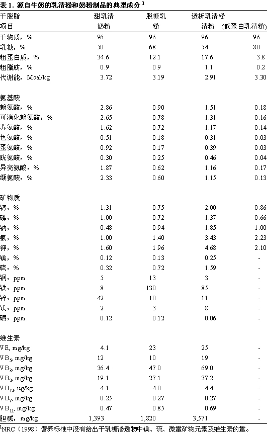 典型的乳清粉含有68%的乳糖和12%的蛋白質(表1)(NRC,1998)。乳清中主要的蛋白質是β-乳球蛋白(56~60%)、α-乳白蛋白(18~24%)、牛血清白蛋白(6~12%)和免疫球蛋白(6~12%)(Harper,2000)。這些特殊的蛋白質不僅可作為氨基酸源,還可作為一種抵抗微生物感染的防御物質,并且是生長因子和調節(jié)劑的來源(Harper,2000)。乳清中發(fā)現的WPC蛋白質濃度雖然都較低,但有著重要的生物學特性,這些蛋白質包括乳鐵傳遞蛋白、乳過氧化物酶、溶菌酶、酪蛋白糖巨肽、磷酸肽和脂肪球膜蛋白質(Harper,2000)。