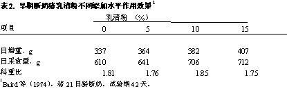 在俄亥俄州立大學、堪薩斯州立大學和密蘇里大學的研究也證實了早期斷奶仔豬日糧中相對高水平乳清粉的效果。Mahan(1992)研究表明,乳清粉添加水平高至35%時對仔豬都有效果(表3)。在WPC一些研究(Graham等,1981;Tokach等,1989;Nessmith等,1997)中也有同樣的報道。雖然有研究指出乳清的一些有益特性在于它所含的蛋白質(Tokach等,1989),但是大部分的研究表明,乳清的有益特性主要歸功于它所含的乳糖(Baird等,1974;Mahan,1992)。