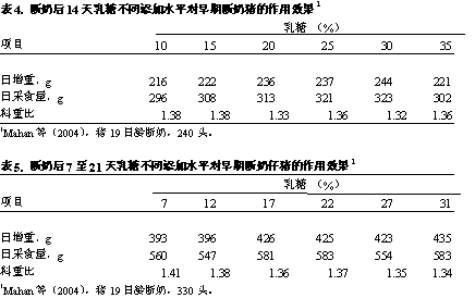 人們關心的是,仔豬保育期的各個階段乳糖的添加量問題。Mahan等(2004)最近對此進行研究發(fā)現,在斷奶后最初的14天(表4)和在斷奶后7至21天(表5),豬對高水平的乳糖均能產生應答。他們推薦在豬斷奶后的1周(7